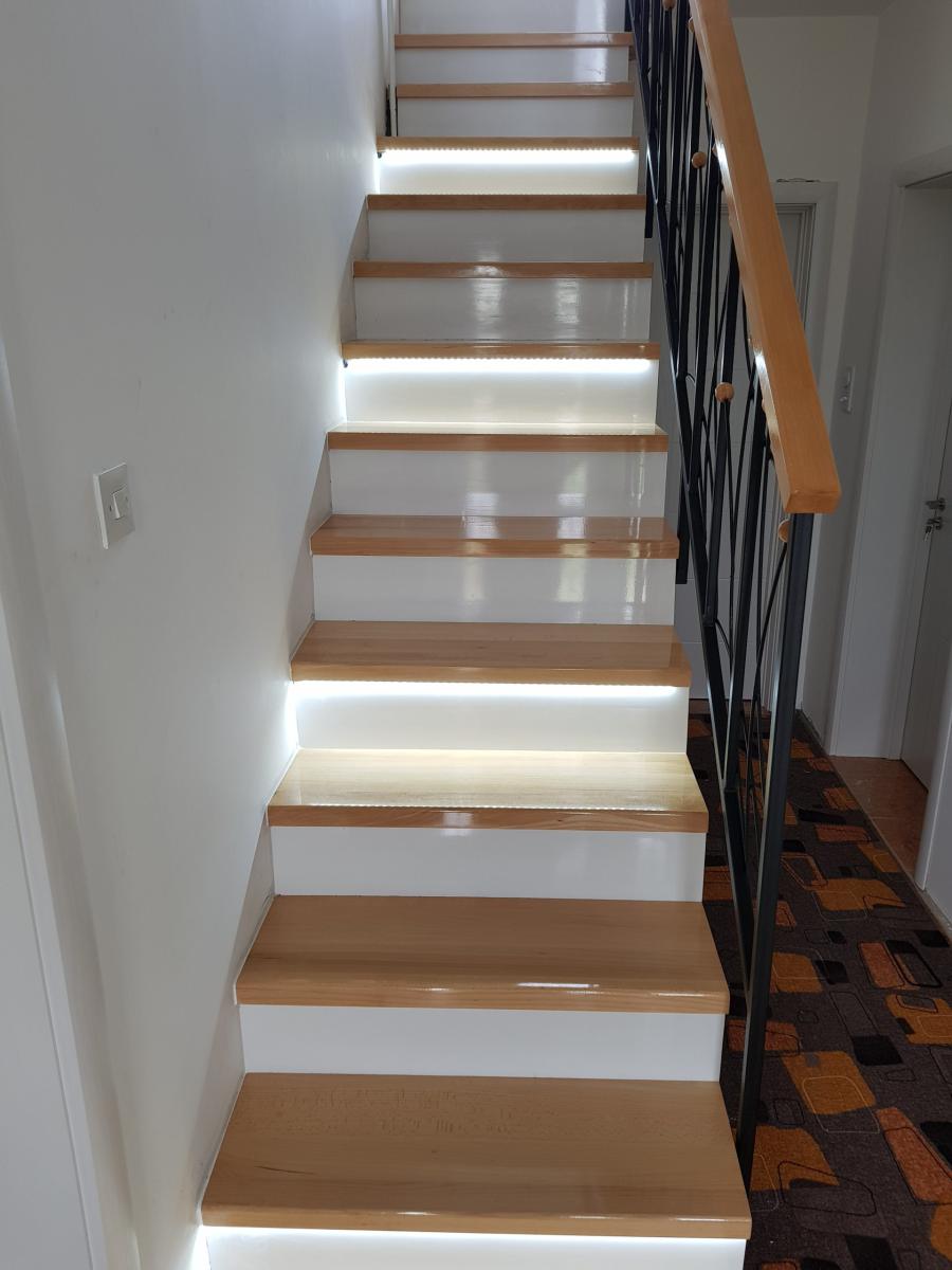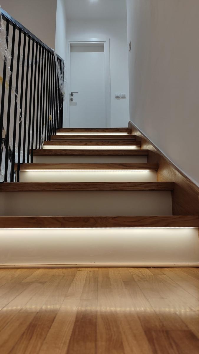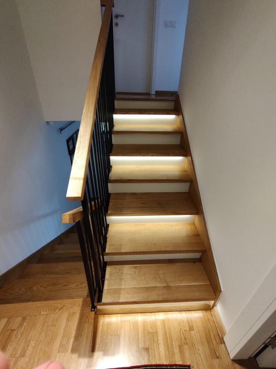 Ukoliko je potrebno dodatno osvetljenje ili klijenti žele naglasiti stepenice – posebnom obradom ubacuju se LED trake sa kanalicama u gazišta.